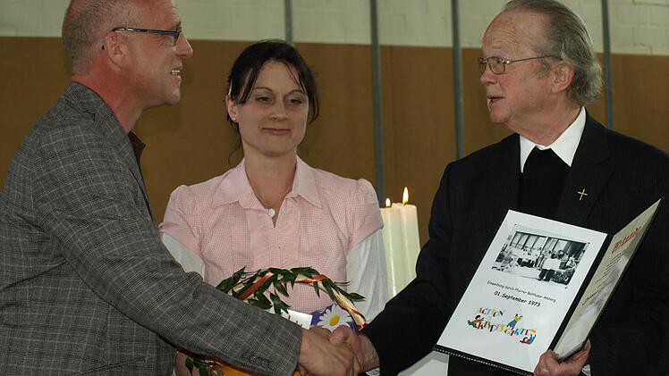 "Sie haben vom ersten Tag an unseren Kindergarten begleitet und seit 1976 im Vorstand verantwortungsbewusst und weitsichtig mitgearbeitet. Wir verleihen Ihnen als äußeres Zeichen die Ehrenmitgliedschaft." So würdigte Holger Zwirlein als Vorsitzender des Action-Kindergarten die Dienste von Pfarrer Balthasar Amberg. Diakon Klaus Eckert überreichte zudem die Ehrennadel des Caritasverbandes in Gold.