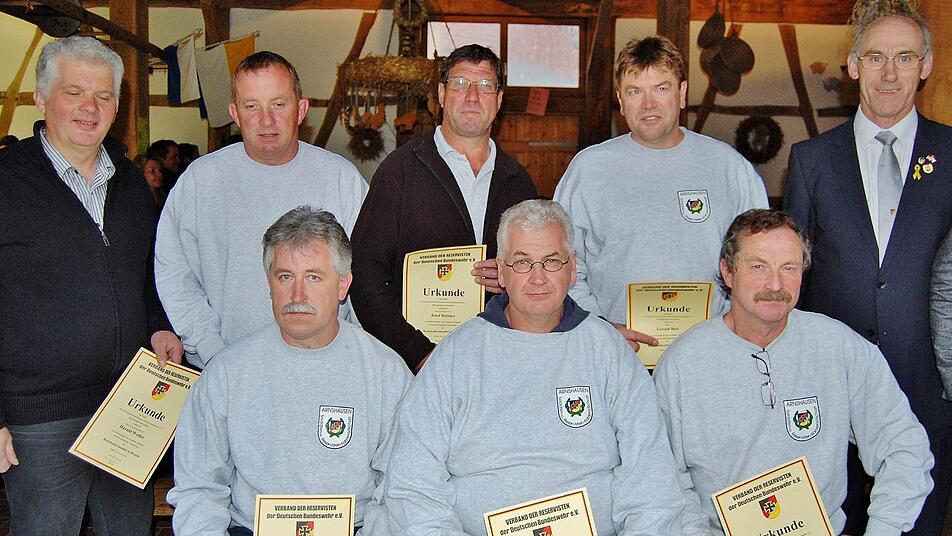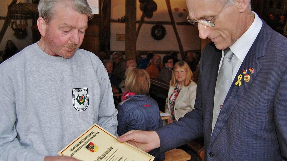 Erhard, Träger der Bad Kissinger Bürgermedaille, lobte die "Pflege echter Kameradschaft" und überreichte im Namen aller Arnshäuser Vereine eine Geldspende. Die Verleihung einer Bezirksverdienstnadel in Gold sowie drei silberner und von vier aus Bronze übernahm Otto Jahrsdörfer als stellvertretender Vorsitzender des Bezirksverbandes der Reservisten der Deutschen Bundeswehr.