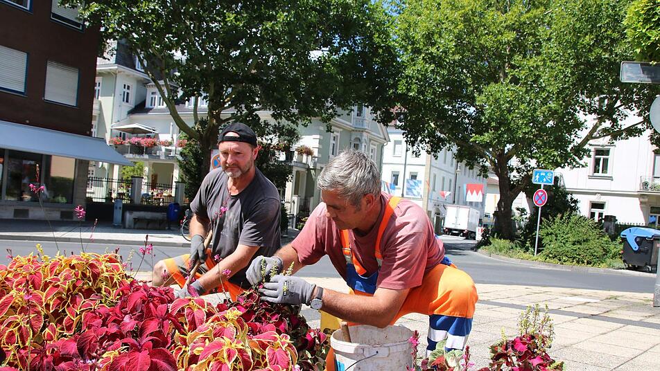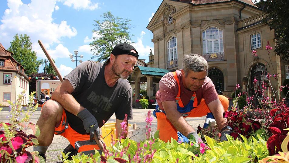 Bad Kissingen putzen aktuell die Grünflächen fürs Rakoczy-Fest raus. "Drei Mitarbeiter sind jeden Tag mit Gießen beschäftigt", erzählt Vorarbeiter Bernhard Schroll. "Die Kurgärtnerei ist links und rechts der Saale zuständig, wir für das städtische Grün." 15 Mitarbeiter hat die grüne Truppe des Servicebetriebs. Bei der aktuellen Hitze stellt die Stadt ihren Mitarbeitern kostenlos Trinkwasser zur Verfügung. Die Gärtner beginnen zudem bereits morgens um 6 Uhr, um die Hitze zu meiden, und: "Ich plane meinen Arbeitstag so, dass ich nicht in der prallen Sonne arbeiten muss." Es gebe genügend Beete im Schatten von Häusern oder unter Bäumen. Die Hitze nimmt Schroll gerne in Kauf, wenn dann auch beim Rakoczy-Fest die Sonne scheint.