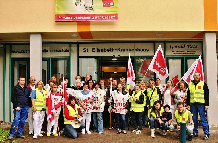 Bad Kissingen — Den Tag der internationalen Pflege nutzte die Gewerkschaft Verdi um mit einem bundesweiten "Flaggentag" auf Missstände in der Pflege aufmerksam zu machen. In Bad Kissingen beteiligten sich über 30 Mitarbeiter des St.-Elisabeth-Krankenhauses an der Aktion. Um fünf vor 12 hatten sich die Beschäftigten zu einer "aktiven Mittagspause" zusammengefunden um für mehr Lohn und bessere