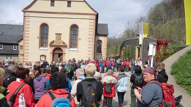 Die von Andreas Scholz vorbereitete Wallfahrersuppe gab es in Waldberg. Danach ging es, angeführt von Kreuzträger Reiner Herold, der seit 18 Jahren Wallfahrtsführer ist, den anstrengenden Kniebrecher hoch. Oben sammelten sich die Teilnehmer. Gemeinsam zogen die Oberthulbaer am heiligen Ort ein, wo sie von Pater Martin, Guardian des Klosters und Bruder Johannes Matthias empfangen wurden.