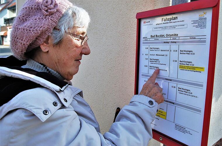 "Diesen Bus habe ich zwei- bis dreimal pro Woche genommen, wenn ich in Bad Kissingen einkaufen wollte, Termine beim Arzt hatte oder sonst irgendetwas in der Stadt zu erledigen hatte", ist Seniorin Eva-Maria Pohl (83) immer noch verärgert. Jetzt bleibt ihr "und vielen anderen Senioren", wie sie festgestellt hat, nur die Wahl zwischen der frühen Abfahrt um 8:11 Uhr oder der späteren um 10:28 Uhr.