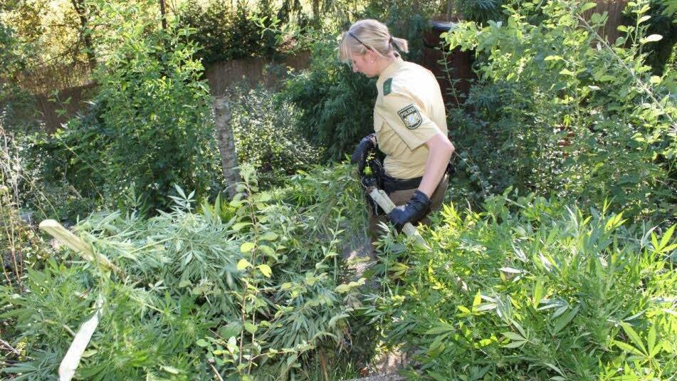 Die Polizei hat wohl einen Hinweis auf die Plantage erhalten. Als sie vor Ort ist, muss erst ein Hundeführer verständigt werden. Denn auf dem Gelände sind zwei Hunde. Doch die erweisen sich als zutraulich . Selbst der polizeiliche Trubel bringt die beiden Tiere nicht aus der Ruhe. Sie wollen höchstens schnuppern.