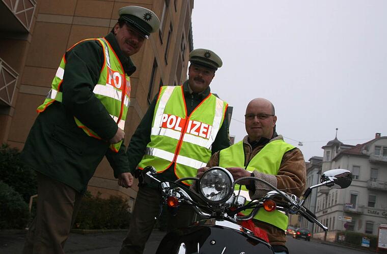 Auf dem Weg zur Arbeit Das gilt auch für Daniel Mohr. Der 42-Jährige ist auf einer besonders schönen Vespa unterwegs zur Arbeit, als die Polizeibeamten ihn beschenken wollen. Er befürchtet schon, zu spät zu kommen, als Matthias Kleren ihn an den Straßenrand winkt. Aber um die Warnweste anzulegen, nimmt er sich die Zeit. "Das ist sinnvoll", sagt er auf seinem Vespa-Roller sitzend. "Zwischen halb acht und halb neun ist viel Verkehr", weiß er aus Erfahrung, "da ist es gut, wenn man rechtzeitig erkannt wird". Noch schnell von Martin Kaiser der Hinweis, dass die geschenkte Warnweste auch sonst im Straßenverkehr gute Dienste leistet, dann ist Daniel Mohr wieder weg. Die Arbeit ruft.