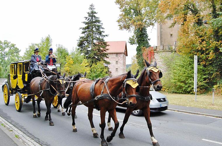 Urgewächs" begrüßte, lobte das Schloss als "Leuchtturm-Projekt", weshalb auch der Postkutschendienst von Bad Kissingen zum Schloss und nach Bad Bocklet unterstützenswert sei. Sandwalls Frage, wie viele Hufschläge das Vierergespann wohl im Laufe einer Saison tätigen müsse, konnte Postpräsident a.D. Werner Scheller nicht beantworten.