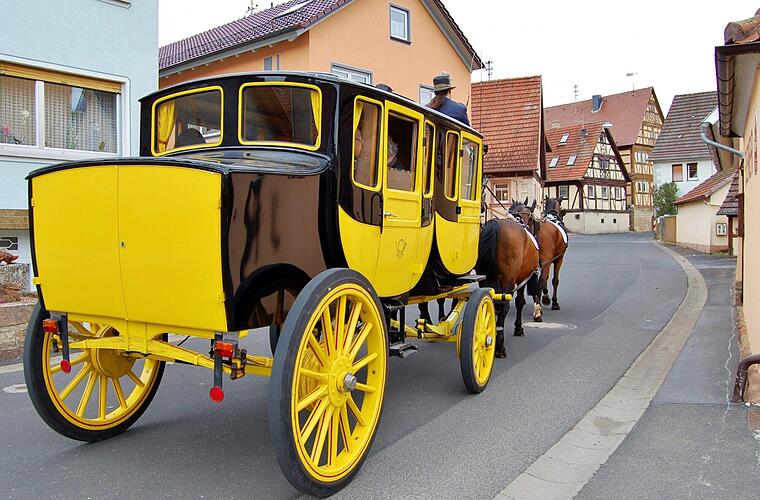Hoch auf dem gelben Wagen reist heute niemand mehr zu Urlaubsdomizilen oder gar Geschäftsverhandlungen. Das ändert aber nichts an der Romantik, die mit dieser Art der Fortbewegung verbunden ist. Seit Sommer 1950 fährt eine Postkutsche von Mai bis Oktober zweimal wöchentlich von Bad Kissingen durchs Saaletal nach Bad Bocklet und Schloss Aschach. Die Bad Kissinger Postkutsche ist die einzige ihrer Art und die letzte Linie der Deutschen Post - und ein touristisches Wahrzeichen der Region.