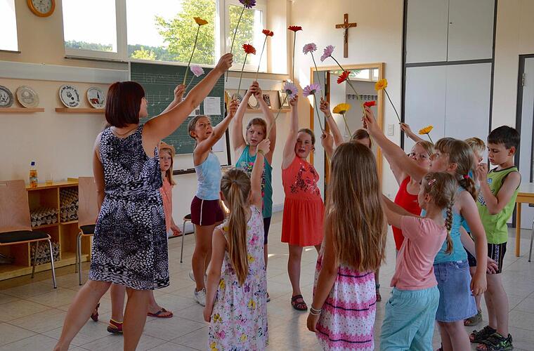 Stillstehen und singen? Das geht gar nicht. Stattdessen ist Bewegung angesagt. Mal mit Blume, mal mit Partner, schließlich tanzen auch noch alle zusammen. Entsprechend turbulent geht es bei der Gesangsprobe des Stralsbacher Kinderchores in der Alten Schule zu.
