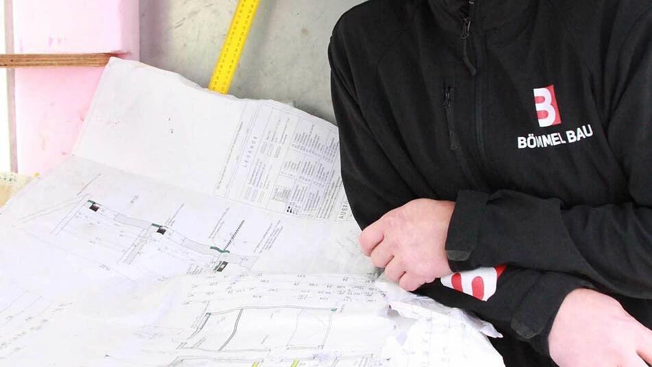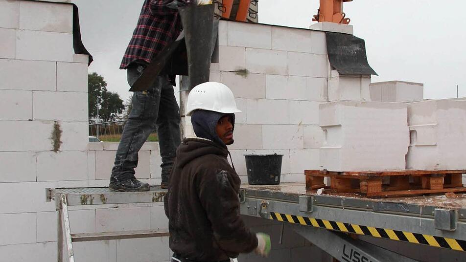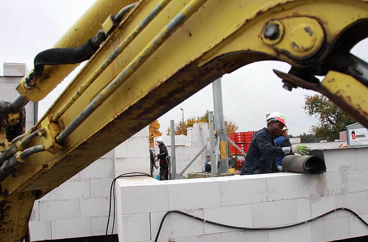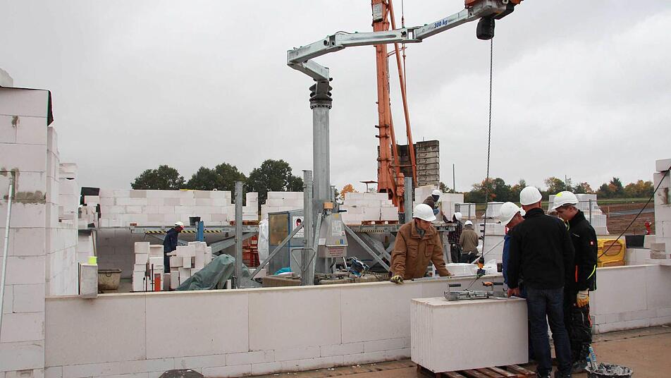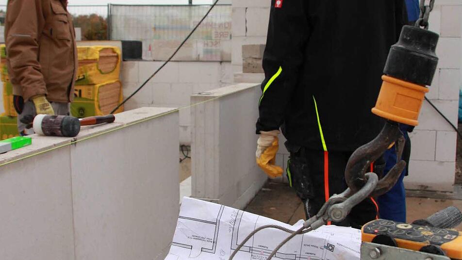 Die Kollegen in der Berufsschule haben nicht schlecht gestaunt, als die Bömmel-Bau-Azubis von ihrem Projekt erzählt haben, sagt Kevin Scheuplein, 18, Maurer-Lehrling aus Bad Bocklet im dritten Ausbildungsjahr. Skeptisch sind sie wohl immer noch, meint er. Dabei sind er und seine Lehrlingskollegen schon mitten drin: Acht Azubis bauen allein ein Haus. Ein Polier lehrt und führt die Auszubildenden auf der Baustelle.