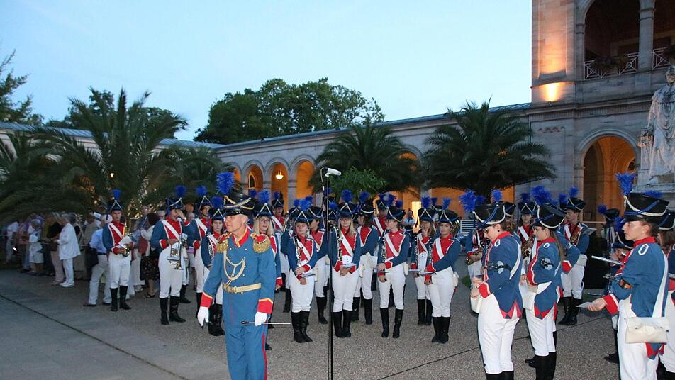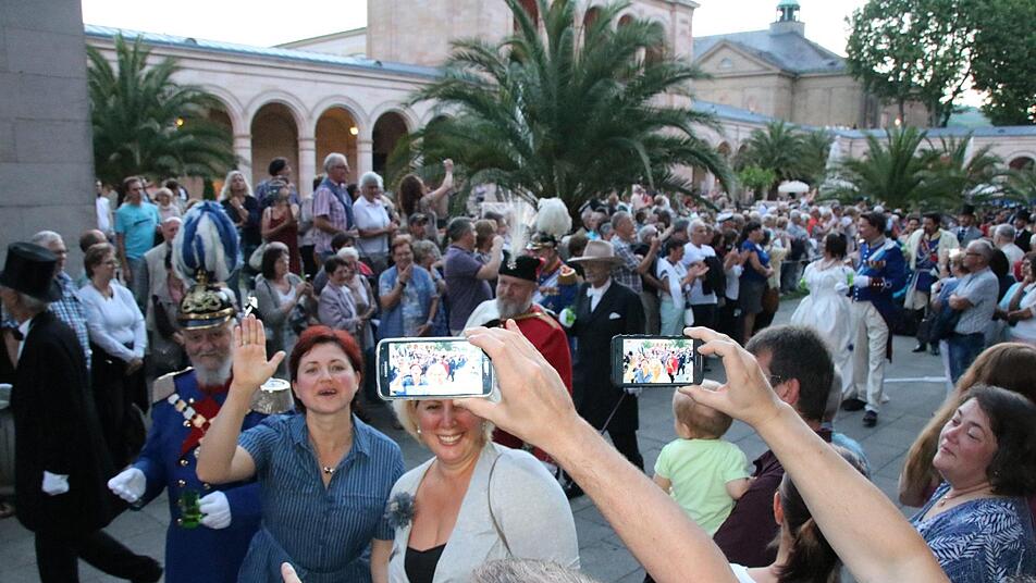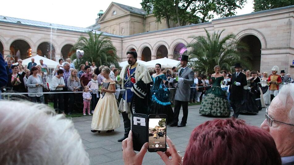 Der Ball lockt auch tausende Schaulustige an: Mit gezückten Handys und Kameras warteten Zaungäste im Kurgarten. Nach dem feierlichen Einzug der Persönlichkeiten im Regentenbau flanieren die "Historischen" und alle Ballbesucher durch die Kuranlagen. Erkennungszeichen und Eintrittskarte zurück zum Ball ist ein Trinkglas, deshalb der Name "Gläserpolonaise".