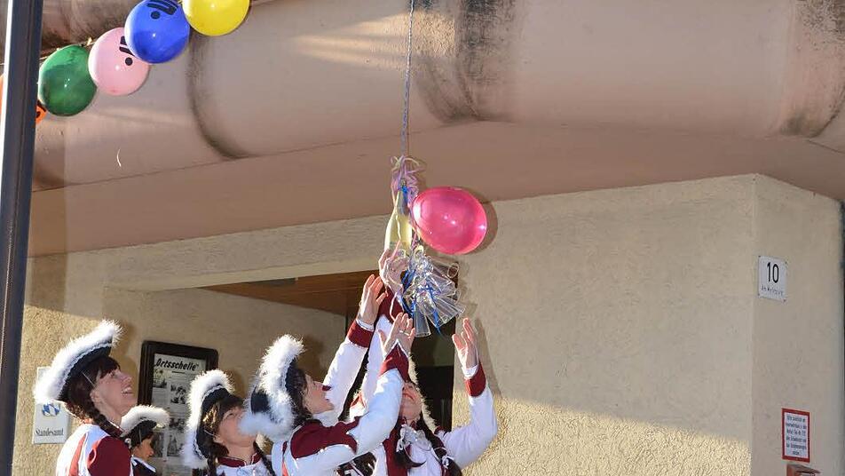 Hier begann der Bürgermeister etwas zu wackeln, öffnete die Stadtkasse und warf einige alte DM-Scheine ins Volk. Seine Verteidigungsrede "wenn wir an der Lauterer Kreuzung schon einen Kreisverkehr hätten, würdet ihr da oben noch immer im Kreis laufen" heizte die Stimmung aber noch mehr an und während erste Cowboys den Rathausbalkon über die mitgeführte Leiter erklommen, enterte die Tanzgarde das von "Sheriff Bug" verrammelte Rathaustor. Es kam, wie es kommen musste, statt einem Fläschchen Sekt wollte die weißberockte Garde lieber den Rathausschlüssel und so ließ sich letztendlich Bürgermeister Waldemar Bug willig von den Katzemicher Gardedamen fesseln und abführen.
