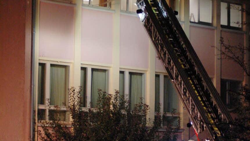 Das Übungsszenario hat es diesmal in sich. Die langen Flure sind schon vollständig eingenebelt. Die Nebelmaschinen machen unaufhörlich weiter. Derweil rufen Kinder und Erwachsene im obersten Stockwerk um Hilfe. Der Rauch dringt schon aus den Fenstern, an denen die Hilfesuchenden stehen. An manchen Fenstern scheinen tatsächlich bereits Flammen zu lodern. "Das sind Lichteffekte. Unser künstliches Feuer sozusagen", erklärt Helfrich.