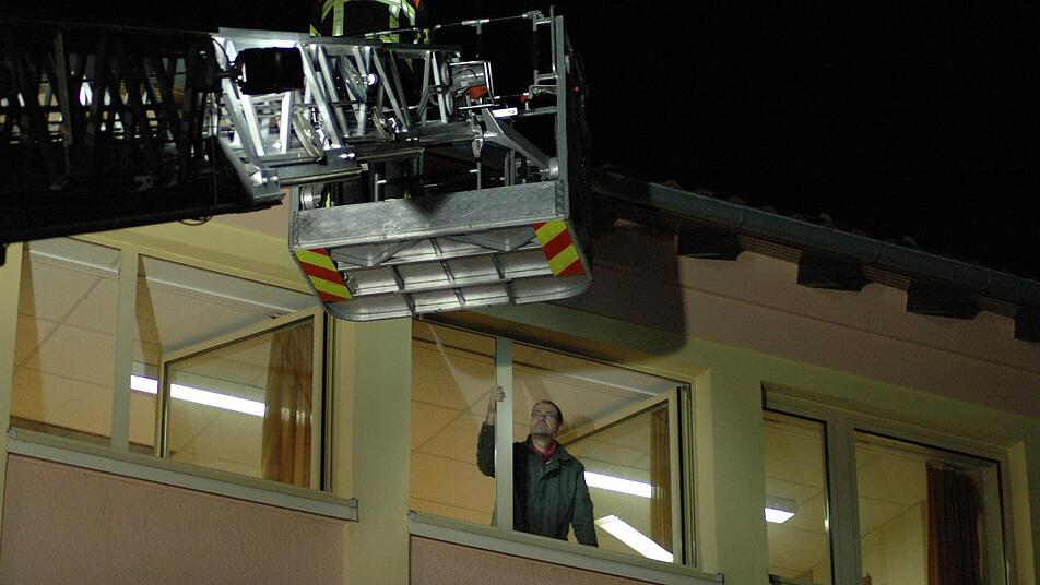 "Die Atemschutzträger werden sich im Gebäude auf die Suche nach Menschen begeben. Im Ernstfall könnte sonst auch kein anderer hinein." Zusätzlich wird noch die mobile Drehleiter der Bad Brückenauer Feuerwehr angefordert, um die Personen aus dem obersten Stockwerk retten zu können. Und so greift ein Rädchen ins andere.