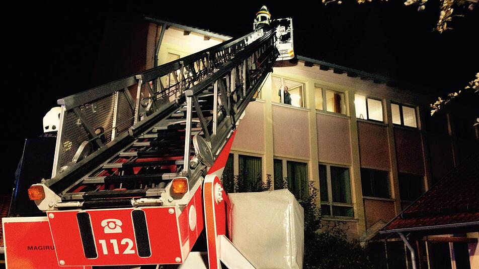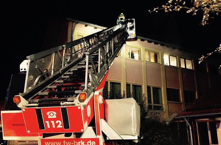 Als die Drehleiter aus Bad Brückenau eintrifft, wird die Beleuchtung verstärkt. Die zu rettenden Personen stehen rufend und gestikulierend an der Fensterfront. Beeindruckend, mit welcher Geschwindigkeit und millimetergenauen Präzision die Drehleiter samt Rettungskorb in Position gebracht wird. Zunächst werden die Kinder und Frauen in Sicherheit gebracht, dann die Männer.
