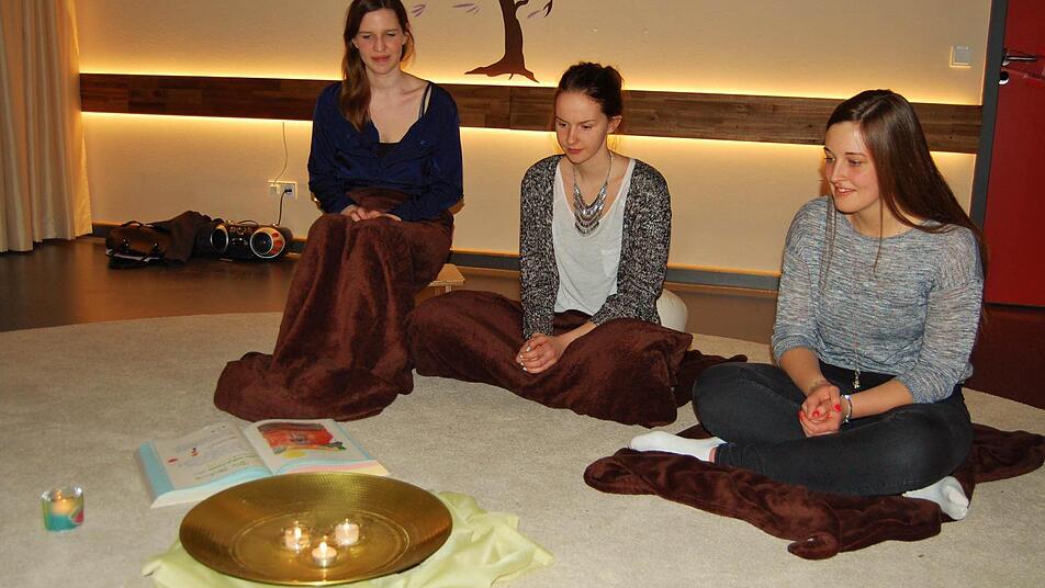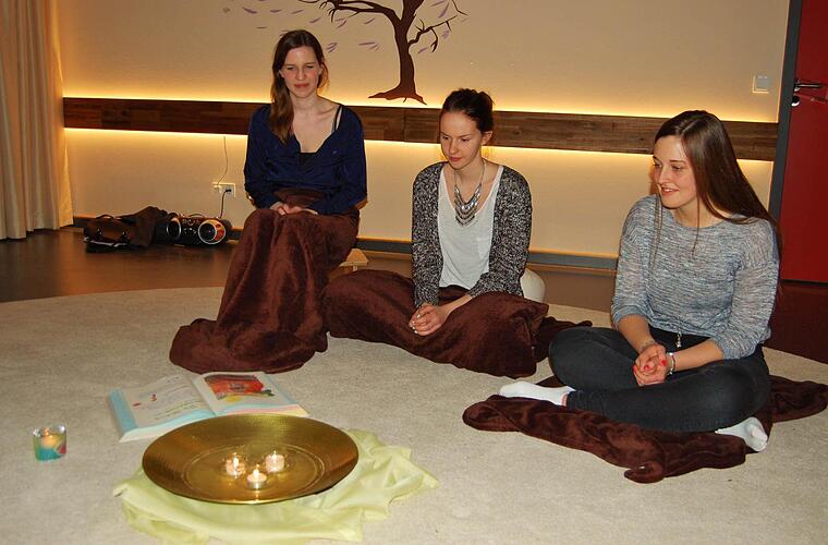 Fotos 01 + 02: Die am Projekt beteiligten Schülerinnen (von links) Sophie Schuhmann, Franziska Seidl und Ulrike Storch beim Meditieren im Raum der Stille
