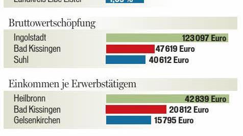 Das Landkreis-Ranking kommt hier zu einem anderen Ergebnis: Unter 90 bayerischen Kreisen und kreisfreien Städten liegen nur der Landkreis Schweinfurt (Platz 26 in Bayern, 51 bundesweit) und die Stadt Würzburg (28/62) in die erste Hälfte. Die Stadt Schweinfurt findet sich gar erst auf Platz 83 (bundesweit 286) wieder.