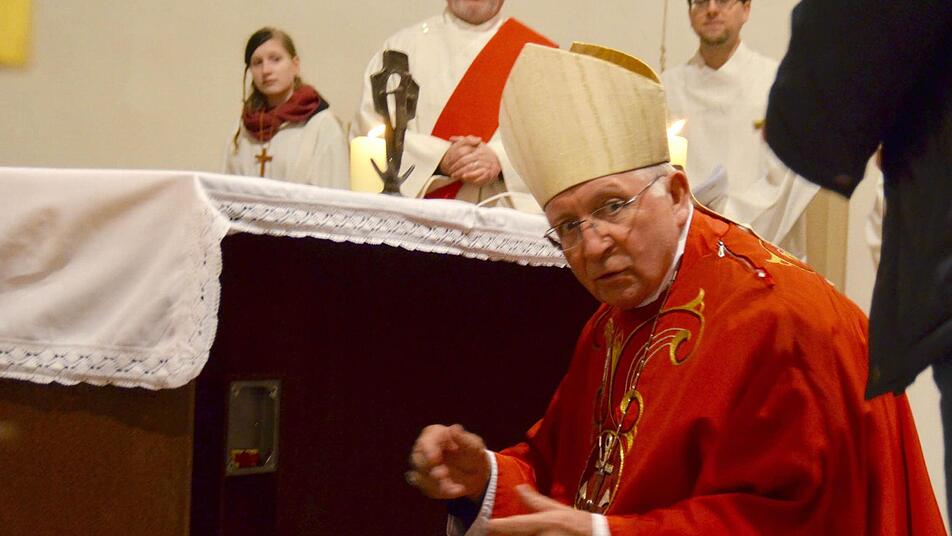 Etwa 80 Bewohner der Pfarrei Burkardroth feierten mit Weihbischof Ulrich Boom den Gottesdienst, darunter auch Hannah und Eva. Die beiden achtjährigen Mädchen bereiten sich derzeit auf ihre Erstkommunion vor und hielten während der gut eineinhalbstündigen Feier gut durch. Von der eigentlichen Beisetzung jedoch bekamen sie nur wenig mit. Die ging ihnen viel zu schnell. "Am Interessantesten aber war, dass der Bischof immerzu seine Mütze gewechselt hat", so Hannah.