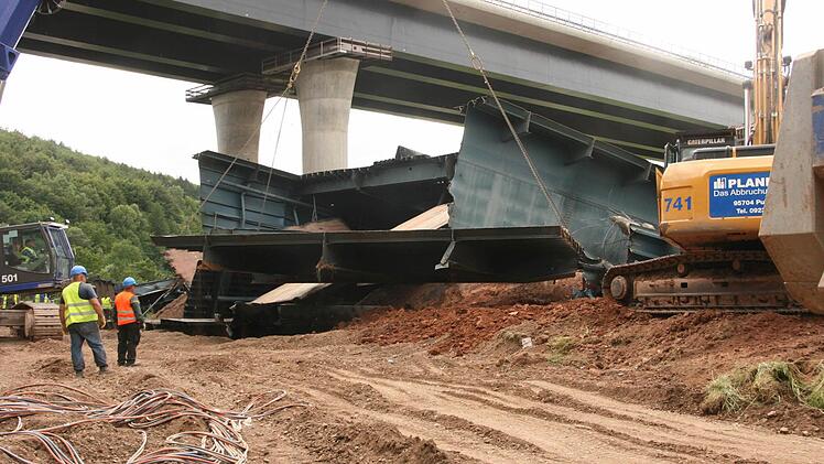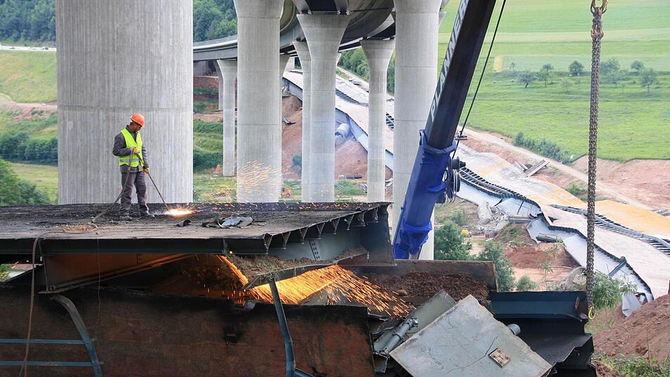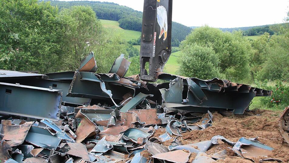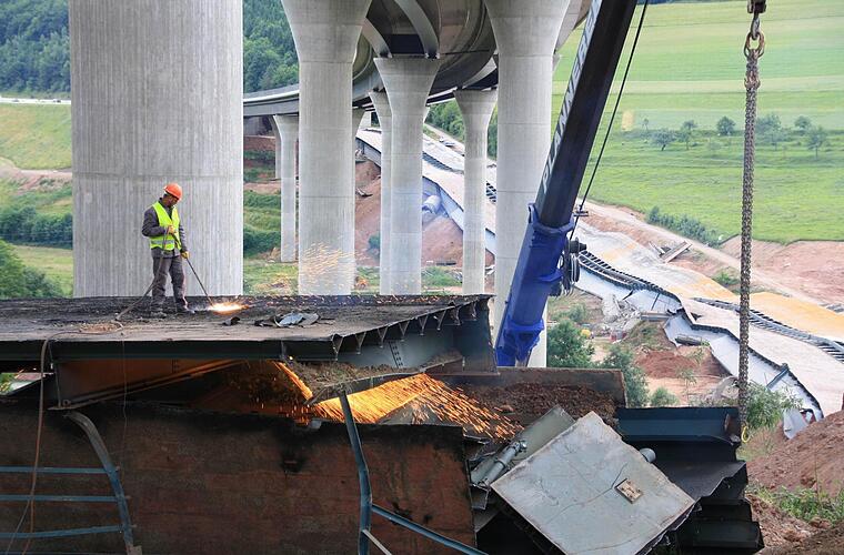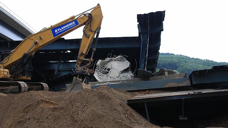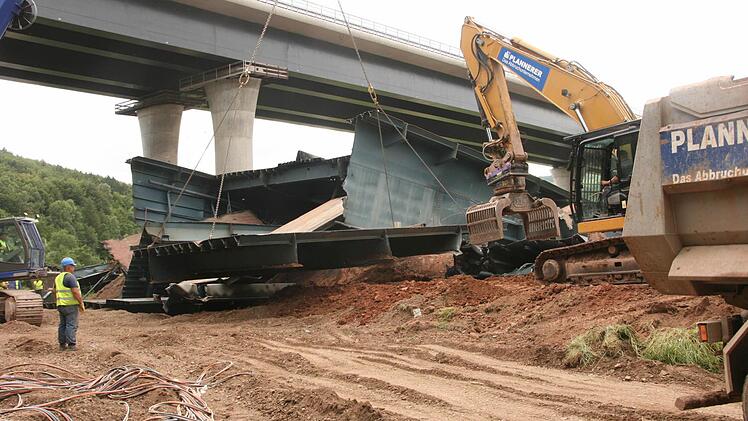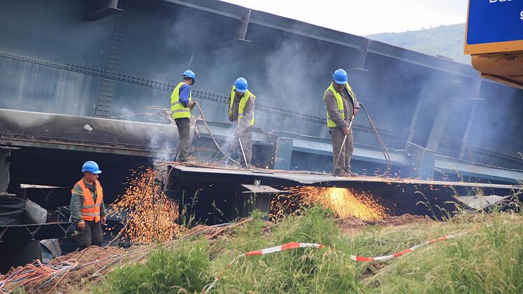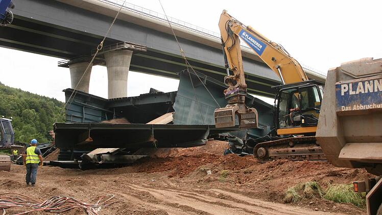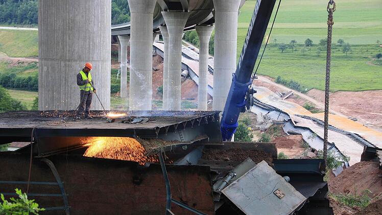 Zehn Wochen lang tragen 30 Arbeiter nun mit Brennschneidern und Baggern den Schutt- und Schrottberg der gesprengten Sinntalbrücke in Riedenberg (Kreis Bad Kissingen) ab. Die 11.000 Tonnen sind komplett recyclingfähig.