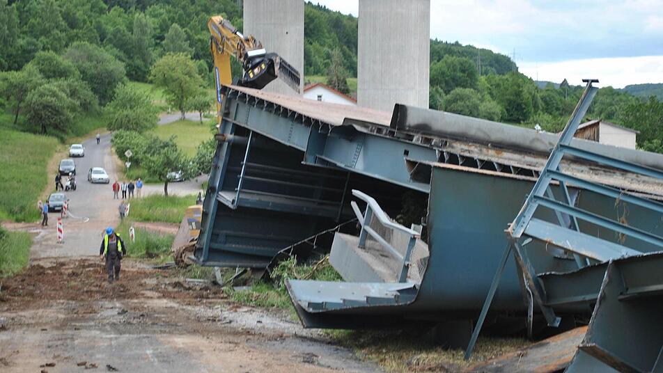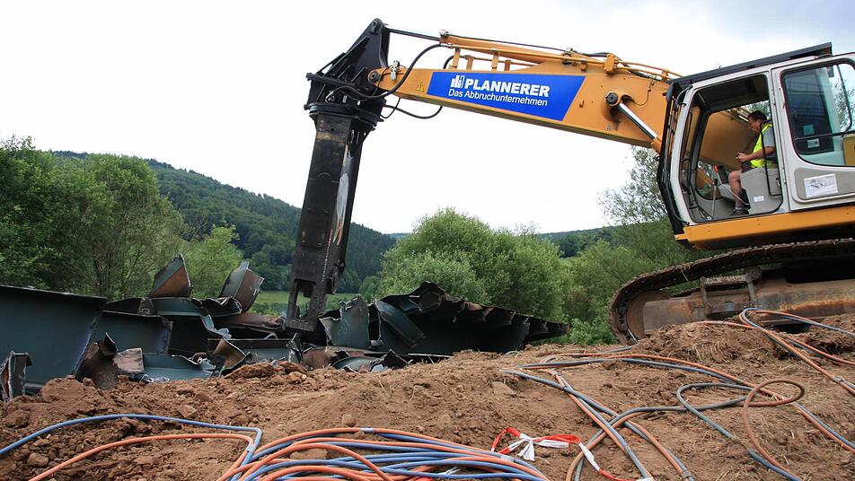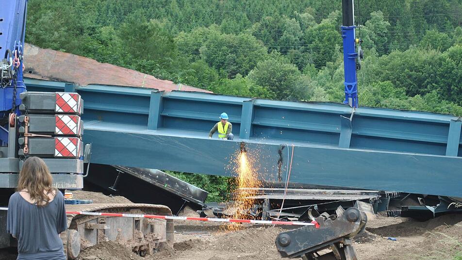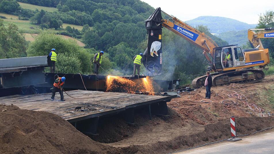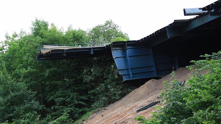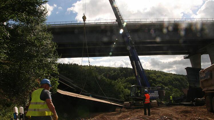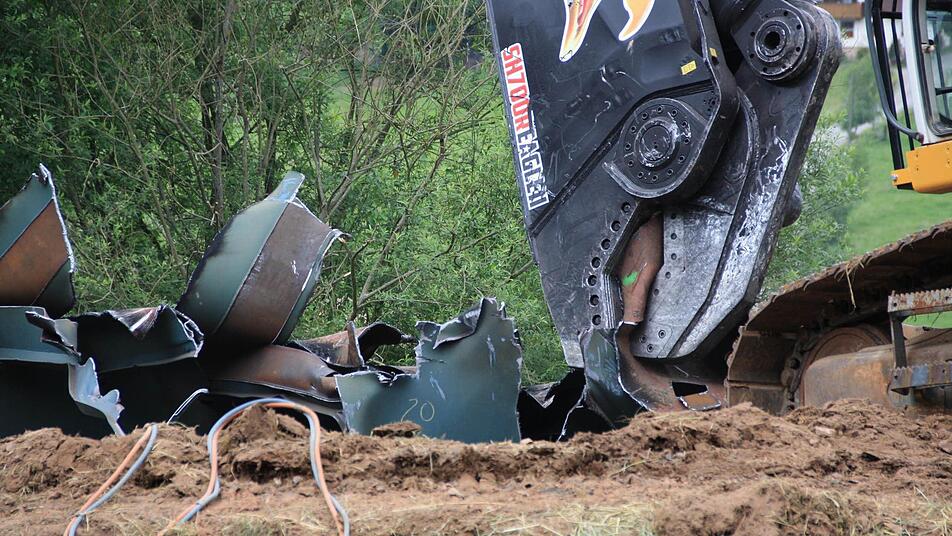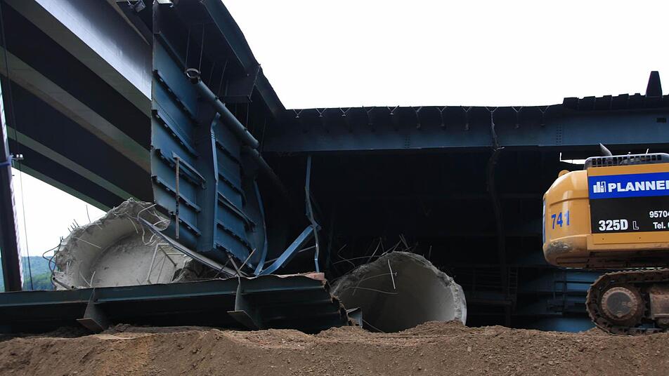 Zehn Wochen lang tragen 30 Arbeiter nun mit Brennschneidern und Baggern den Schutt- und Schrottberg der gesprengten Sinntalbrücke in Riedenberg (Kreis Bad Kissingen) ab. Die 11.000 Tonnen sind komplett recyclingfähig.