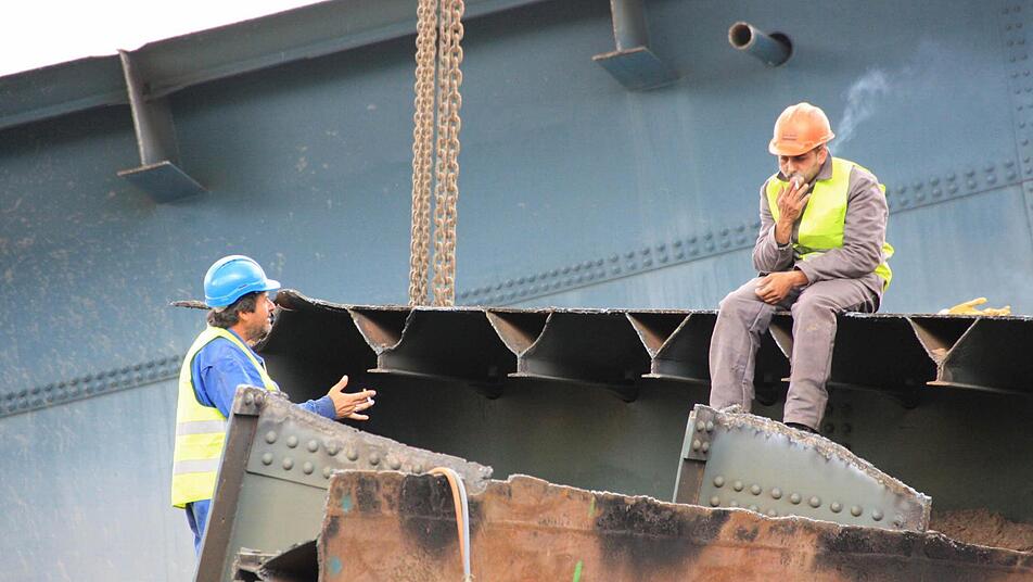 Rund 30 Mitarbeiter zerlegen die Brücke derzeit Stück für Stück. Die großen Brocken werden mit Brennschneidern abgetrennt. "Das machen wir in zwei Schichten von 4 bis 22 Uhr", berichtet Plannerer. Bagger mit speziellen Aufsätzen schneiden dann kleine Stücke ab, die wieder eingeschmolzen werden können.