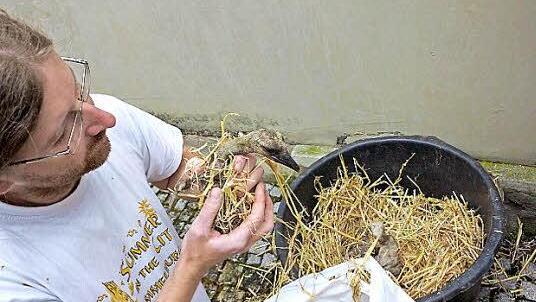 Drei prominente Tiere hat Jochen Willecke bei sich zu Gast. Er päppelt wahrscheinlich bis Sonntag drei Storchenküken auf. "Im Nest hätten sie keine Überlebenschance", erklärt er.