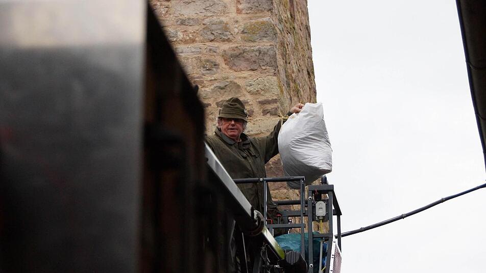 Oben am Nest packt er diese in eine mit Stroh gefüllte Plastiktüte, um sie warm und sicher nach unten zu transportieren. Am Mönchsturm versammeln sich derweil Passanten und Schaulustige.