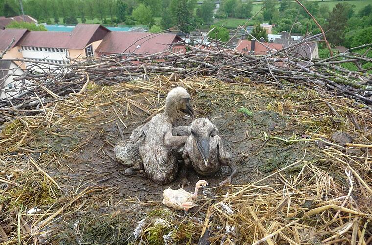 Der Dauerregen kann für die Küken tödlich sein, vor allem weil sich in der Feuchtigkeit der Aspergillus-Schimmelpilz gut entwickelt. Im Jahr 2009 hatte dieser den ersten Storchennachwuchs dahingerafft.