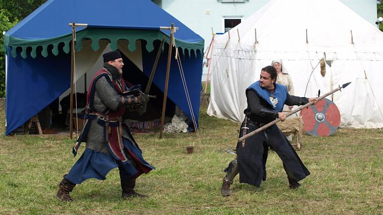 trägt. Christian Heiner, im Alltag Schreiner, ergänzt: "Wir bringen viel, viel Leidenschaft mit, dazu Zeit und Geld. Wir verwenden die damaligen Alltagsgegenstände, zeigen aber auch Ritterkämpfe. Die sind aber nicht vorne weg abgesprochen, sondern wir streiten mit Schutzkleidung, Schwert und Schild um Punkte nach festem Codex."