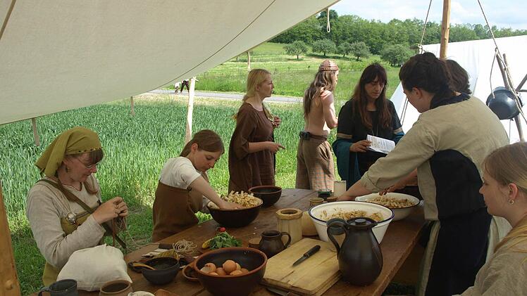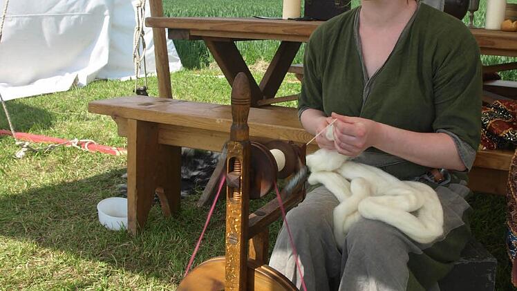 erzählen, bereiten Frauen das Abendessen vor. Eine Frau zeigt derweil "Nadelbinding" als Kombination aus Nähen und Sticken, eine andere bläst ins Rufhorn als Signal, zusammen zu kommen. An anderer Stelle spinnt ein Mädchen Merinowolle zu einem ganz gleichmäßigen Faden. Ein Stand mit vielerlei Gewürzen verbreitet herrliche Düfte.