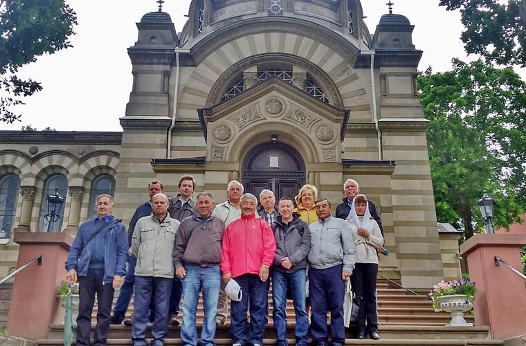 Gästeführer und Tourismus-Stadtrat Sigismund von Dobschütz zeigte der Gruppe vor allem die russischen Bezugspunkte der Kurstadt: Nach Besichtigung der russischen Kirche, die für die Besucher extra geöffnet wurde, führte er sie zum Haus Maxstraße 19, in dem der Schriftsteller Leo Tolstoi im Sommer 1860 wohnte. Vorbei ging es am Sanatorium Fürstenhof und am Hotel Kaiserhof Viktoria, in denen im 19. Jahrhundert viele russische Gäste logierten und die beide heute russischen Investoren gehören.