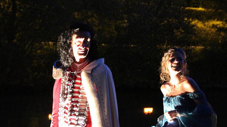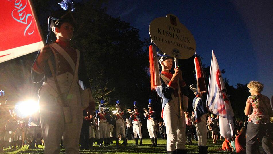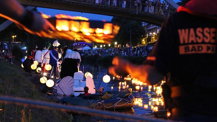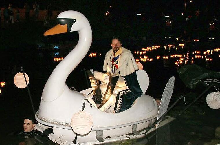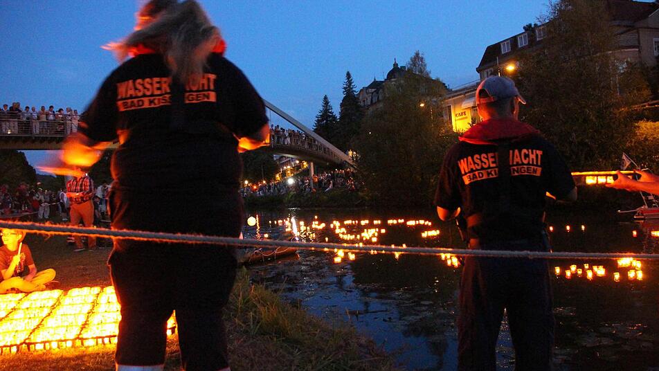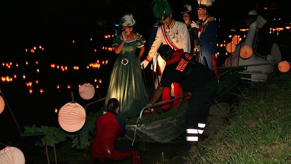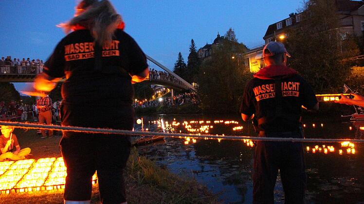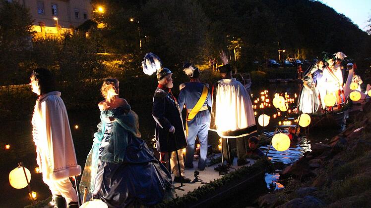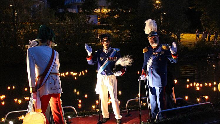 Das erste Boot mit "Historischen" gleitet ins Wasser. Die Taucher ziehen und schieben Sisi und Kaiser Franz Josef, umgeben von flackernden Lichtern sanft vorwärts. Die Quellenkönigin und Fürst Rakoczy folgen - im richtigen Abstand. Den Schluss der Lichterprozession bildet der Märchenkönig Ludwig II. in seinem "Schwan" (ein schwanenförmiges Boot) und grüßt die vielen tausend Besucher, die einmal mehr die einzigartig romantische Atmosphäre einer traumhaften Nacht genießen: Ein Kissinger Sommermärchen schwebt flussabwärts.