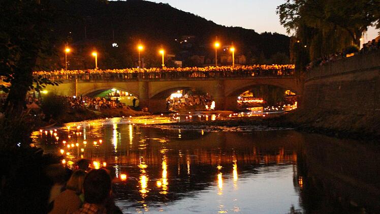 Inzwischen haben die Stadtwerke den Fluss, den sie am Wehr beim E-Werk aufgestaut hatten, wieder freigegeben, um die Fließgeschwindigkeit der Saale zu erhöhen. Es ist dunkel geworden, als eine Rakete vom Wehr das Kommando gibt, die Saale "brennen" zu lassen. Jetzt ist jede Hand gefragt. Die Lichter werden angezündet und Korb für Korb auf den Pontonsteg gebracht, um von dort eine viel bestaunte Reise anzutreten. Die Lichter schwimmen auf, wenn die Körbe darunter ins Wasser gestellt werden. Eine imposante Lichterkette erstreckt sich vom Ufer über den Fluss.