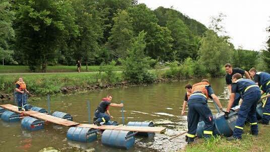 Die Tonnenbrücke, die das THW errichtet hat, ist fertig. Auf dem schwankenden Steg werden die Helfer später die Lichter zu Wasser lassen. Zugführer Dominik Fichtner kontrolliert das Sicherungsseil für das Geländer, prüft, dass der "Power Mond", der später die Szenerie in helles Licht tauchen wird, stabil aufgebaut ist, und dass in den blauen THW-Lkw die Kistchen mit den Lichtern ordentlich gestapelt sind. 20 Helfer sind im Einsatz, fast die Hälfte sind Jugendliche, die sehr motiviert dabei sind, "weil es halt so viel spannender ist unter realen Bedingen am Fluss, als im Übungsraum zu trainieren", meint Alex Renninger (16).
