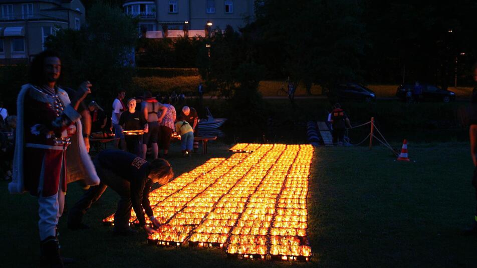Die Thw-Helfer haben inzwischen flussabwärts eine Barriere errichtet, an der die Lichter später aufgefangen werden. "Wir sind fertig. Alles klar bei uns", tönt es zurück. Noch ist es hell und zum " Yellow River", wie es von der Medienwiese schallt, wird die Saale erst in einer Stunde, wenn dreitausend Lichter auf den Wellen schaukeln. Die Saale wird dann in eine gelbrote Feuerschlange verwandelt, auf der die Boote mit Historischen Persönlichkeiten majestätisch stromabwärts gleiten.