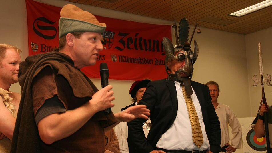 Humor kann sich auch mittelalterlich gewanden: Eine Schandmaske setzte der Thulbaer Bauernhaufen dem Redaktionsleiter der Saale-Zeitung, Paul Ziegler, auf. Mit ihren großen Ohren, den hervorstehenden Augen und der lang gestreckten Zuge charakterisiert die Maske ein Tratschweib, wie Jürgen Kolb erklärte. Bei der Vor-Ort-Veranstaltung der Saale-Zeitung nahm sie aber auch die Aufgabe eines Redakteurs treffend aufs Korn: Alles hören, sehen und weiter verbreiten.