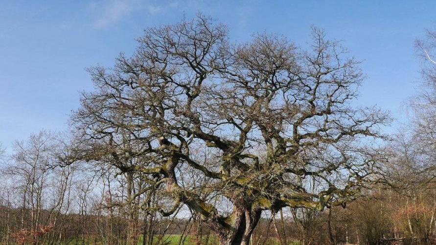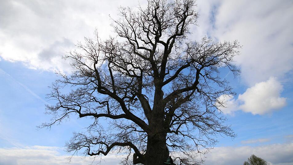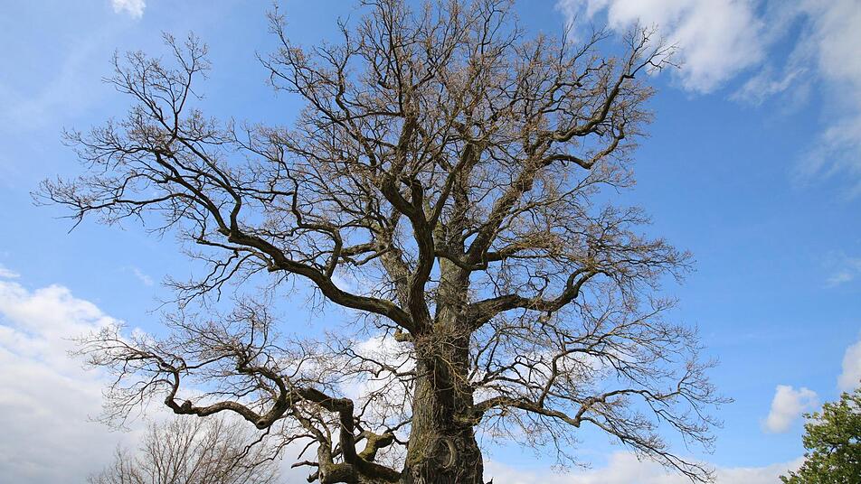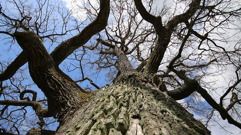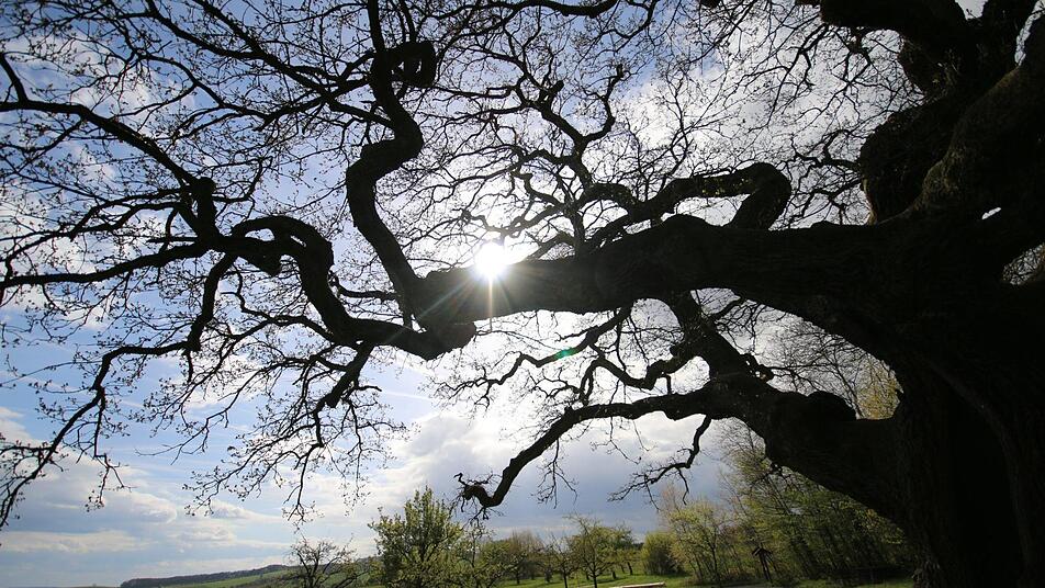 Der Förster der Betriebsgemeinschaft Oberthulba steht vor der Bildeiche in Albertshausen und betrachtet das uralte Exemplar. Die mächtige Eiche steht allein auf einer Wiese am Ortsrand, wo sie genug Licht und Wasser findet, um ungestört zu wachsen. Die ersten Äste, jeder für sich so groß wie ein kleiner Baum, setzen bereits wenige Meter über dem Boden an. "Das ist der Unterschied zu Bäumen, die im Wald stehen", sagt er. Im Wald wachsen sie schlank nach oben, zum Licht. Die unteren Äste sterben ab, die Krone verzweigt sich erst in vielen Metern Höhe.