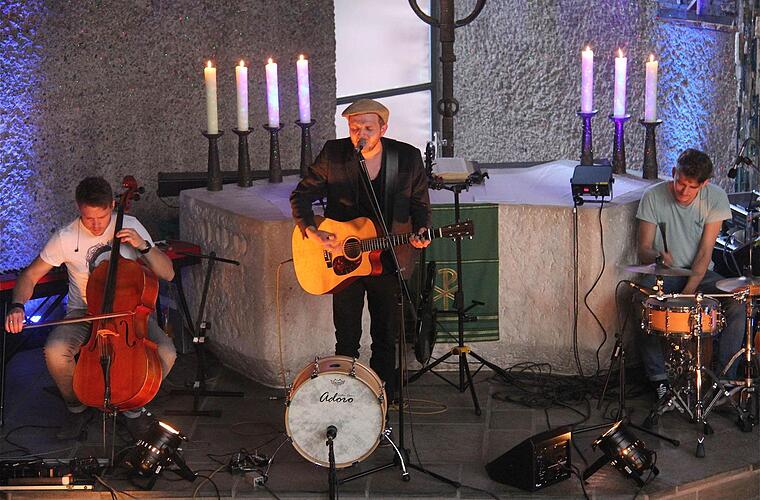 Das zweistündige Konzert von Samuel Harfst (Gesang, Gitarre), seines Bruders David Harfst (Percussion, Klavier, Rhodes) und Dirk Menger (Cello, Klavier, Rhodes, Bass) zog die Zuhörer in der nahezu voll besetzten Michaelskirche in den Bann.