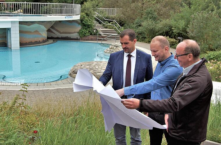Edelstahl statt Fliesen: Bauamtsleiter Jan Voll, Stadtsprecher Mario Selzer und Betriebsleiter Roland Bühner erklären die Details