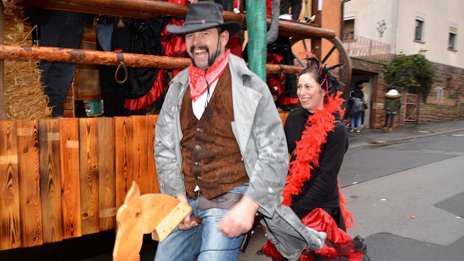 Seit 1978 schlängelt sich der Gaudiwurm alljährlich durch Stangenroth. Heuer waren wieder etliche kreative Gruppen dabei. So etwa ein Saloon aus Holz, den eine Stangenrother Clique gebaut hatte. Die Damen vom Kaffeekränzchen, die sich schon seit 35 Jahren am Zug beteiligen, zeigten sich als feiernde Hausfrauen, getreu dem Motto "An Fasching