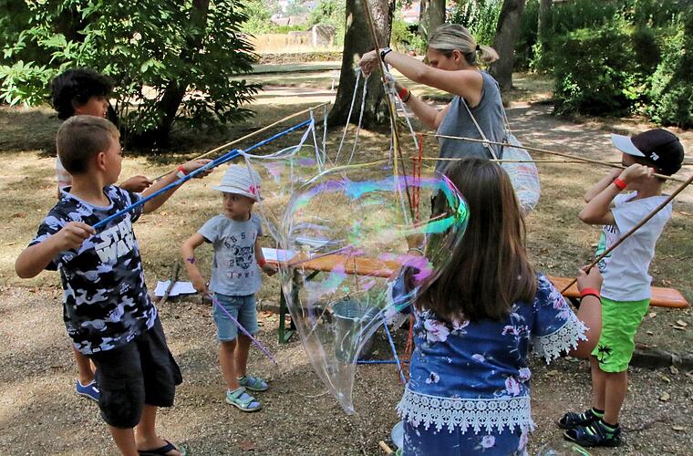 Die Kinder durften auch Windräder basteln und mitnehmen. Nicht ganz so einfach war die Station "Seifenblasen." Doch einige Kinder schafften es, wirklich riesige Blasen zu erzeugen, die dann