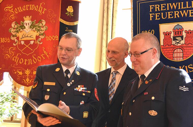 Mit der Übergabe von Urkunden und Fotobüchern durch die beiden Kommandanten Harald Albert und Torsten Grabarits wurde der Bund offiziell im Beisein der beiden Bürgermeister "besiegelt". Die noch lebenden Männer "der ersten Stunde der Freundschaft" Manfred Schmid, Karl Heinz Brand, Herbert Röttinger Bernd Sterrmann, erhielten jeweils persönlich einen gläsernen Gedenkstein, die beiden Kommandanten Torsten Grabarits und Harald Albert nahmen stellvertretend für ihre Feuerwehren einen Stein entgegen. Aber auch Wolfgang Kopatz von der Feuerwehr Schorndorf und Karl Heinz Mehringer von der Feuerwehr Bad Kissingen erhielten Erinnerungssteine für Aktivitäten zur Aufrechterhaltung der Feuerwehrfreundschaft. Wie diese entstanden ist, gab der Schorndorfer Manfred Schmid in einem kleinen Rückblick bekannt. Bedauerte dabei, dass der ehemalige Bundesgrenzschutz mit Standort in Oerlenbach der eigentliche Auslöser war, inzwischen aber durch Umstrukturierungen "ausgestiegen" sei.