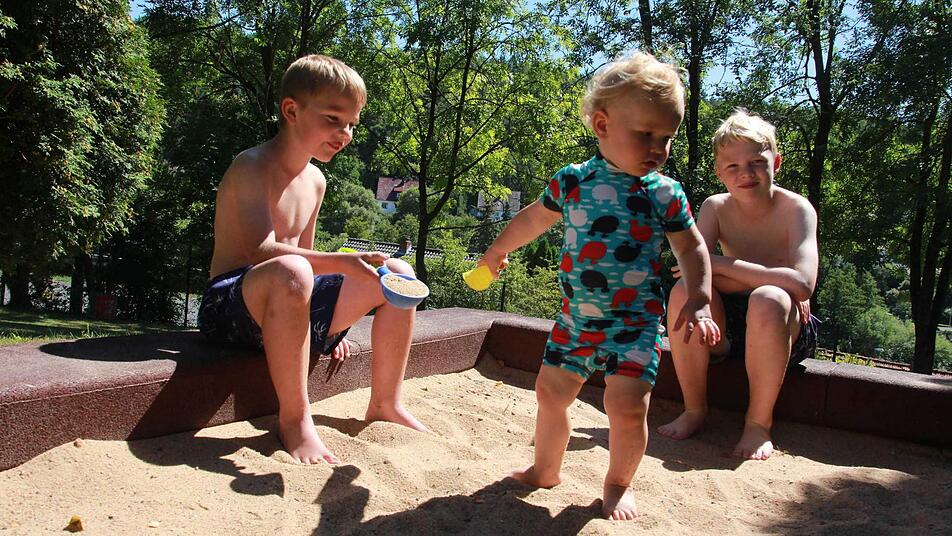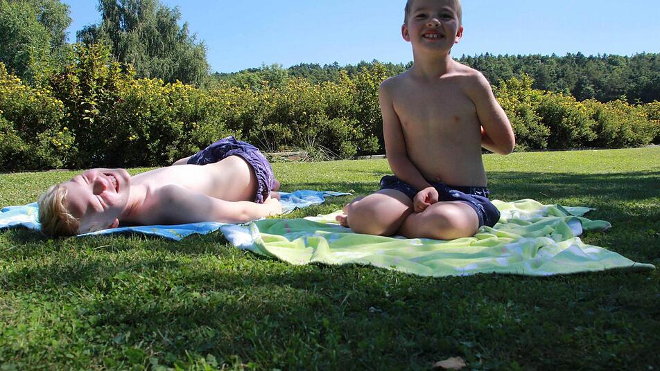 Eine Familie aus der Umgebung, die ihre Lieblingsspielsachen selbst mitbringt, kann für wenig Geld über den Dächern des Ortes im Maßbacher Freibad einen schönen Nachmittag verplanschen.