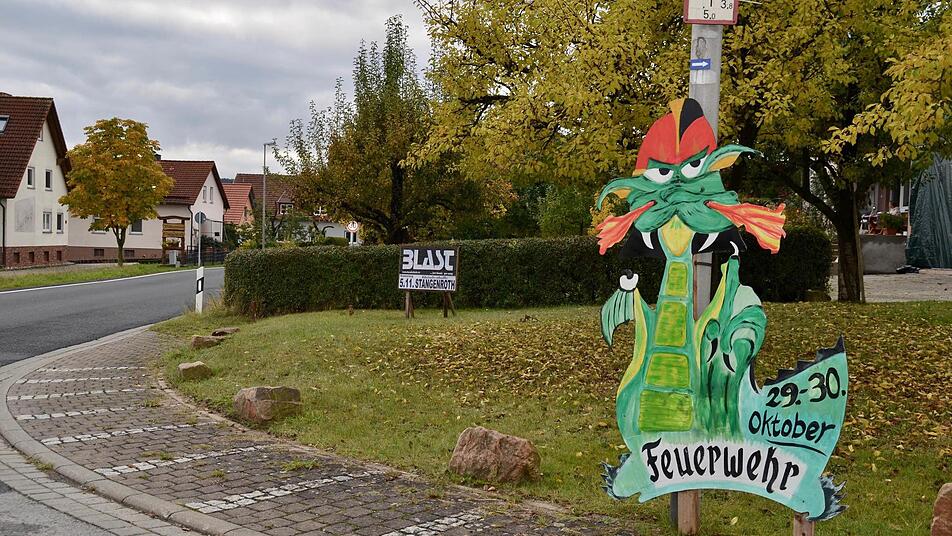 In Stangenroth sind die Drachen am Ortseingang auch Maskottchen. Diese gibt es seit 1998, wurden von Jürgen Gärtners Frau geschaffen. Sie sind seither Boten des alle paar Jahre stattfindende Feuerwehrfestes, so auch heuer.