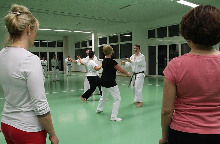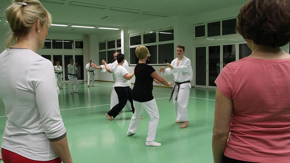 Wenig Überfälle im Landkreis "Die Fälle sind sehr selten", sagt Stefan Haschke, der Leiter der Bad Kissinger Polizeiinspektion. Im vergangenen Jahr zählten die Beamten im Landkreis zehn sexuelle Nötigungen, bei denen Frauen angegangen wurden. Darunter war ein Überfall. Meistens passieren die Übergriffe innerhalb von Beziehungen, erklärt Haschke. "Gewalt gibt es häufig im bekannten Umfeld. Täter und Opfer kennen sich." Zufallstäter sind Ausnahmen. "Deshalb ist das Ausweichen so wichtig", sagt Andreas Haberzettl. "Die Situation mit Freunden oder Bekannten lösen, bevor sie eskaliert." Der 53-Jährige steht in seinem weißen Karateanzug vor den acht Frauen. Ein Grundprinzip für die Selbstverteidigung: "Aus der Angriffslinie gehen. Der Kraft des Gegners ausweichen." In Zweiergruppen spielen die Mädchen und Frauen einen Konflikt nach. Sie schlüpfen in die Rolle des Opfers und des Angreifers. Um dem Täter überhaupt etwas entgegen setzen zu können, sei die Atmung von großer Bedeutung, ebenso wie ein fester Stand: "Nur wer atmen kann, kann auch reagieren." Vor Schreck bleibt vielen sprichwörtlich die Luft weg, erklärt der Trainer.