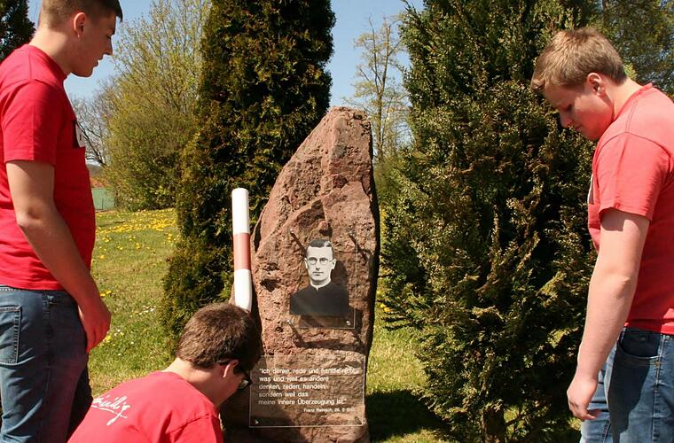 Der Gedenkstein für Pater Reinisch am Rande des nach ihm benannten Wegs, war die erste Kissinger Station der Filmcrew, die das Leben des "Schönstatt-Märtyrers" dokumentarisch aufbereitet. Auch den Eindruck von der Umgebung der ehemaligen Kaserne, in die Pater Reinisch eingezogen wurde, wollte Angela Marlier, Pressereferentin der Pallottiner und Leiterin des Projekts, einfangen.