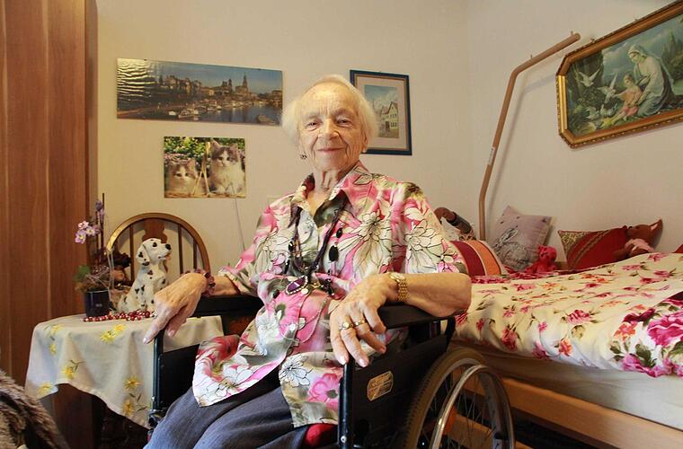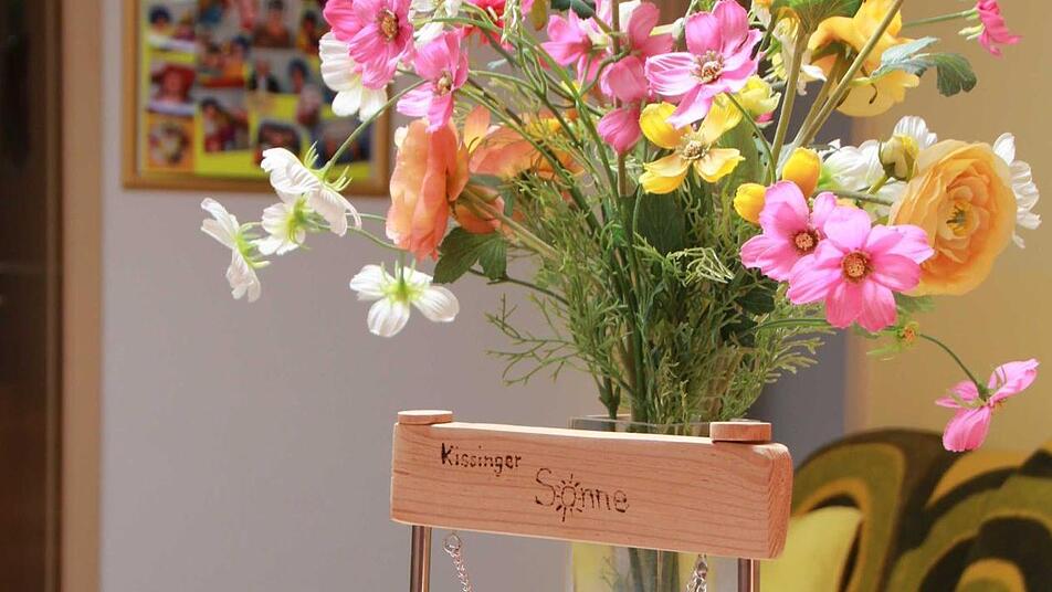 Lila mag sie gern. Und gelegentlich einen Schoppen am Abend. Und ihre Möbel, die Anita Diez von zu Hause mitgebracht hat in das 23-Quadartmeter-Zimmer. Rosa Rosen aus Stoff, die Familie auf Fotos, Porzellanschalen und der Dalmatiner-Welpe auf dem Beistelltisch - "es ist ein Daheim, nur anders organisiert", sagt Erika Eichhorn, Geschäftsführerin der "Kissinger Sonne".