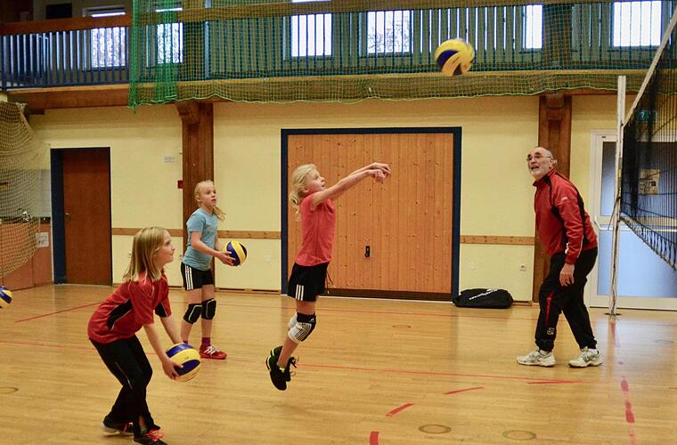 Bei den beiden handelt es sich um Lara Enzmann und Hanna Walkenhorst, neun und zehn Jahre alt. Sie gehören zum U 12- und U 14-Kader der Volleyball-Abteilung des TSV Aschach und trainieren immer mittwochs in der Zehnthalle. So auch diesmal. "Leider fehlen heute verletzungsbedingt zwei Mitspielerinnen ", erklärt Trainer Walter Kuhn, 66 Jahre alt, pensionierter Lehrer.