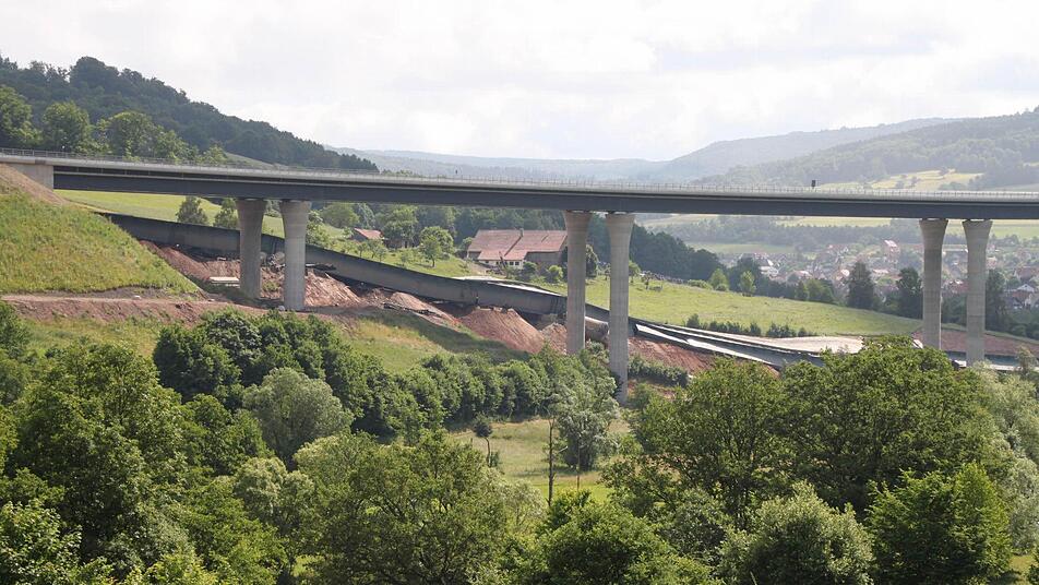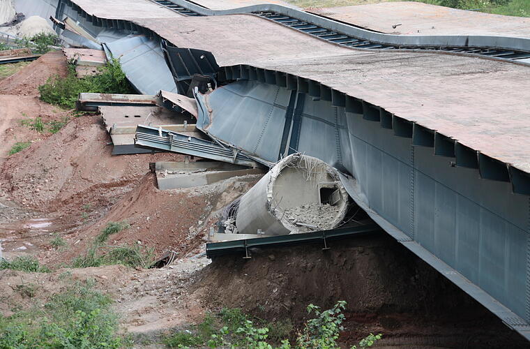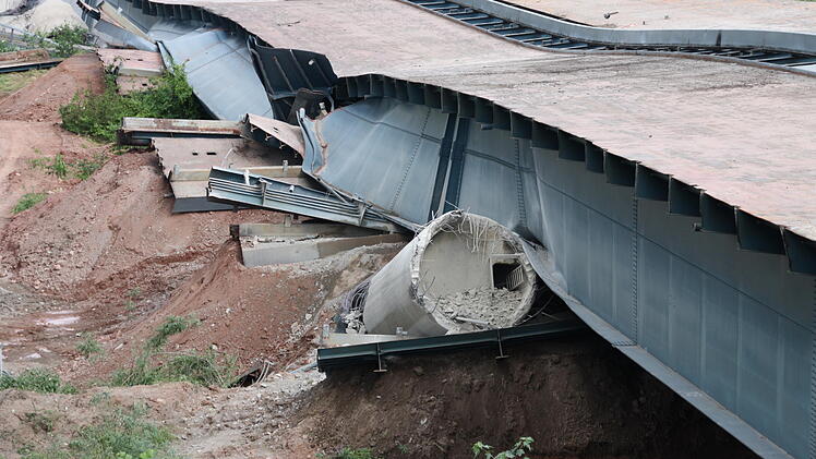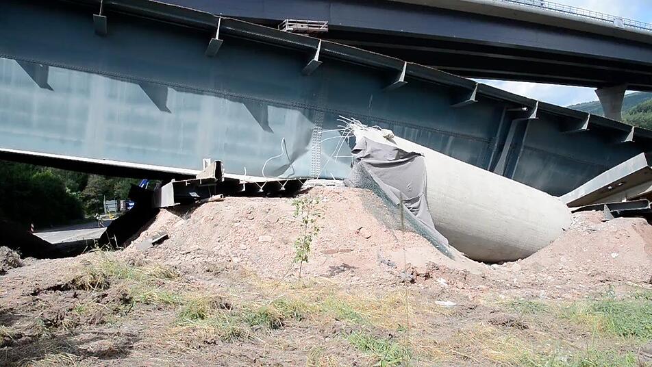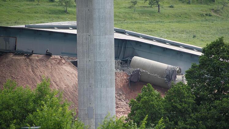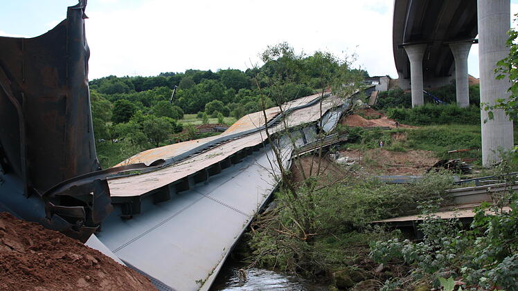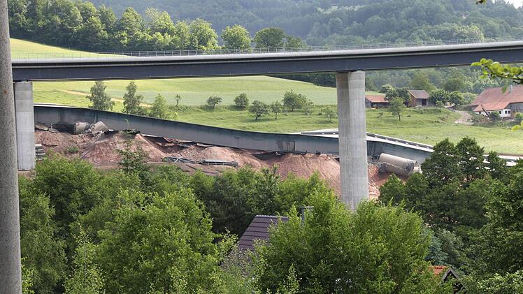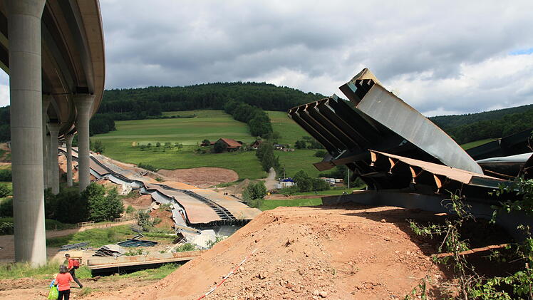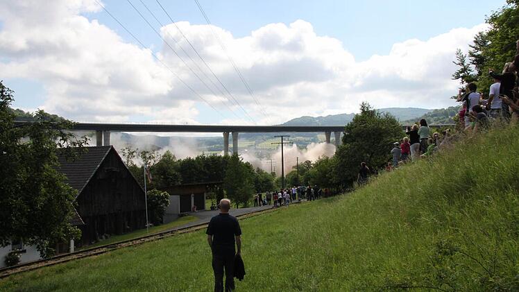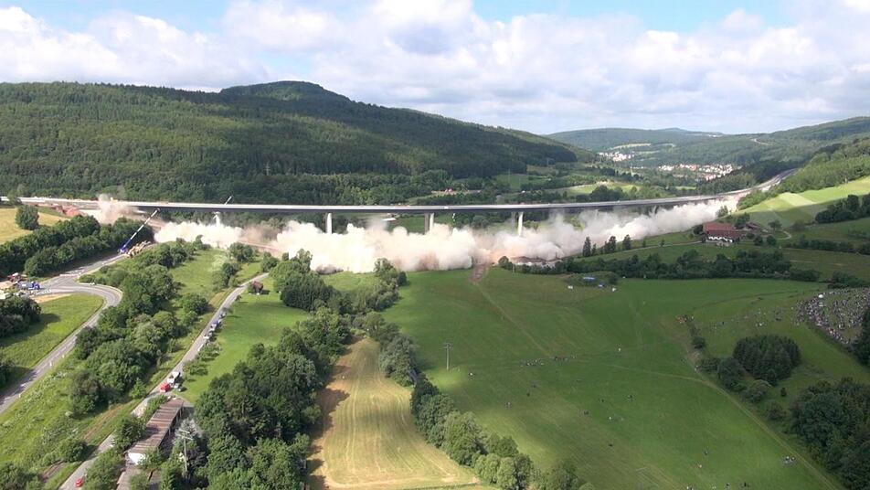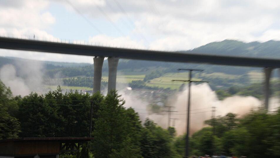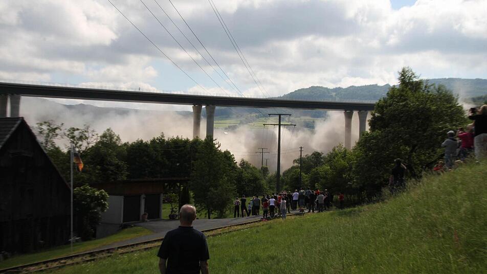 Ein lauter Knall. Und wer sich nicht rechtzeitig umdreht, hat schon alles verpasst. In vier Sekunden sackte die alte Sinntalbrücke in sich zusammen. Dicker Staub legt sich über die Baustelle, hüllt die neue Brücke ein und setzt sich auf die angrenzenden Häuser. Familie Hüfner vom Röderhof wird Fenster putzen müssen.