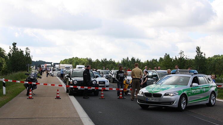 An der Kreuzung in Römershag machen zwei Streifen die Straße dicht. "Zur Autobahn kommt man gar nicht mehr?", fragt ein Mann aus seinem weißen Audi heraus. "Nein", ruft ein Polizist herüber. Derweil schieben sich Fußgänger und Fahrräder an ihm vorbei.