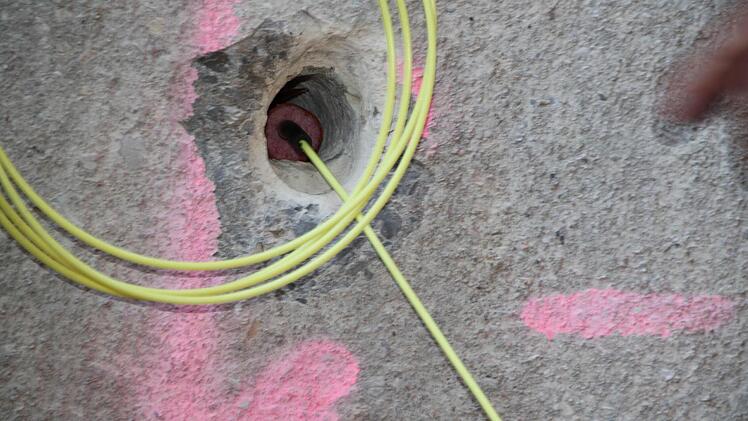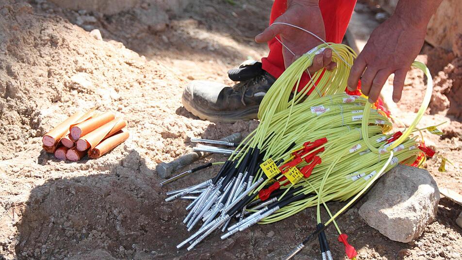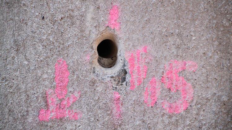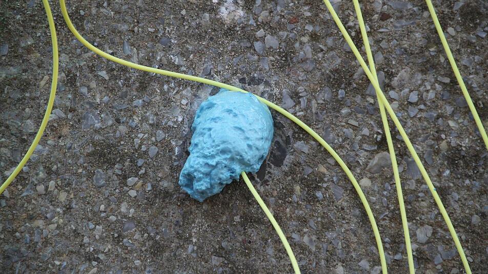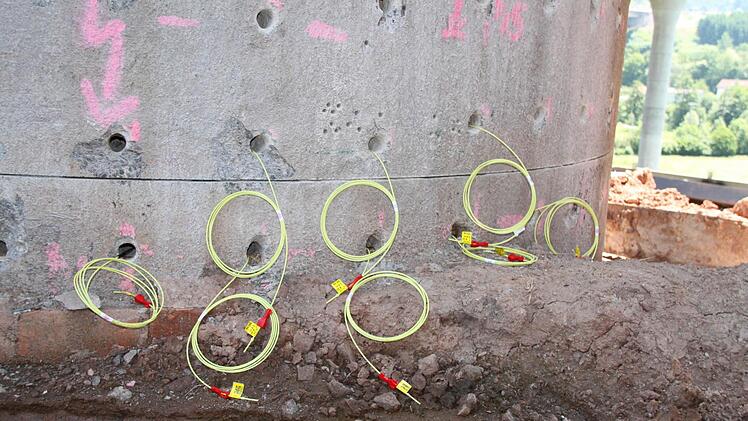 Schneider nimmt ein rotes Kabel in die Hand, das an einem Pfeiler angebracht ist. Es ist die Sprengschnur, mit der die gelben Zündschläuche verbunden sind. Deren Enden stecken wiederum in den Sprengstoff-Rollen. Die sind mit Bauschaum in den einzelnen Löchern befestigt. Was sich als buntes Muster über den Pfeiler zieht, funktioniert alles ohne Strom. Innen sind die Schnüre mit Sprengstoff ausgedampft. Ein elektronischer Impuls genügt und schon geht die Sprengpatrone hoch.