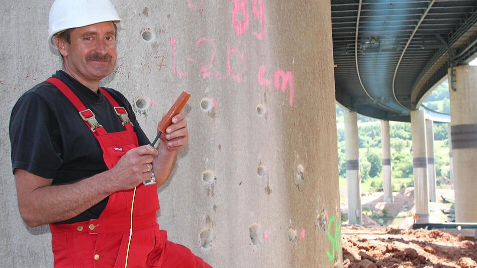 Es gibt zwei Gründe, warum Michael Schneider unter der Sinntalbrücke steht und die Bohrlöcher füllt. Der eine ist die "Affenliebe" zum Beruf - wie er es nennt. Der andere hat mit der Wende 1989 zu tun.